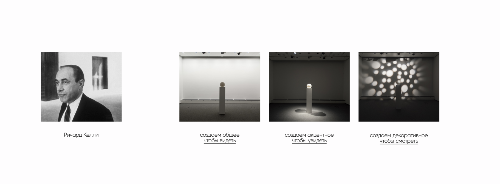 Ричард Келли, по праву считающийся родоначальником «световой архитектуры» и профессионального светодизайна, считал, что свет — не декоративное дополнение, а ключевой элемент создания атмосферы. Именно он первым предложил принцип дифференцированного освещения и разделил свет на три функции: